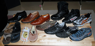 Back Right, from L to R: Steel toe work boots, oil resistant sneakers for garage use, running shoes.